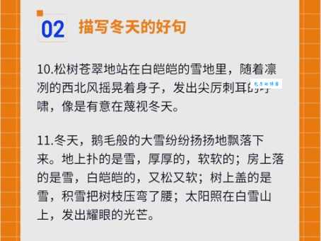 是不是很简单易懂? 是不是感觉一下子就掌握了很多描写冬天的词汇和句子了呢? 其实,描写冬天,重点在于抓住它的特点,比如寒冷、静谧、洁白等等。 你还可以根据自己的感受,添加一些其他的修饰词,让你的描写更加生动形象。 比如,你可以说“鹅毛大雪”,来形容雪花的巨大; 你可以说“寒风刺骨”,来形容风的寒冷; 你还可以说“银装素裹的世界,仿佛童话故事里的冰雪王国”,来渲染冬天的美景。
